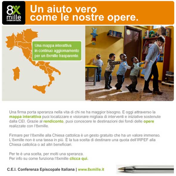 All’interno dell’e-mail, appositi link al sito www.8xmille.it e al sito www.chiediloaloro.it, permetteranno ai destinatari di navigare dentro la mappa delle opere; di consultare il rendiconto, di vedere con i propri occhi le opere realizzate e di scoprire come funziona l’8xmille.