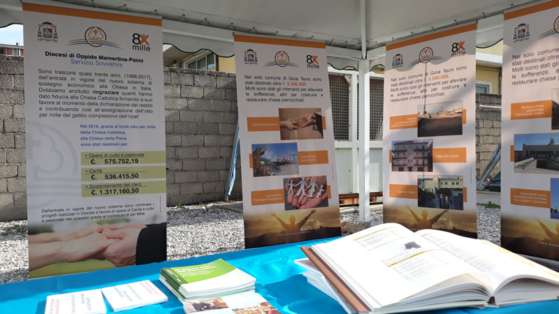 Il convegno è stato arricchito dalla presenza di uno stand (in foto), nel quale erano presentati i molti progetti realizzati nei trenta anni del “sovvenire”, grazie ai fondi 8xmille, nel solo comune di Gioia Tauro. Oltre 5.500.000 euro investiti nel solo comune di Gioia Tauro nelle 4 parrocchie presenti per opere di carità e per edilizia di culto.